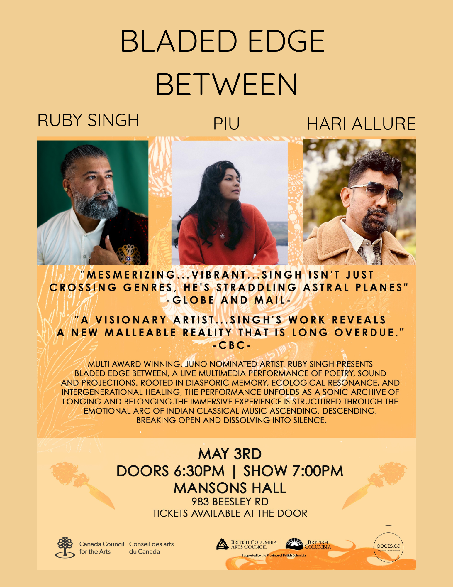 Experience an immersive evening of poetry, sound, and visual storytelling with Bladed Edge Between, a powerful live performance presented by Ruby Singh, alongside Piu and Hari Alluri.